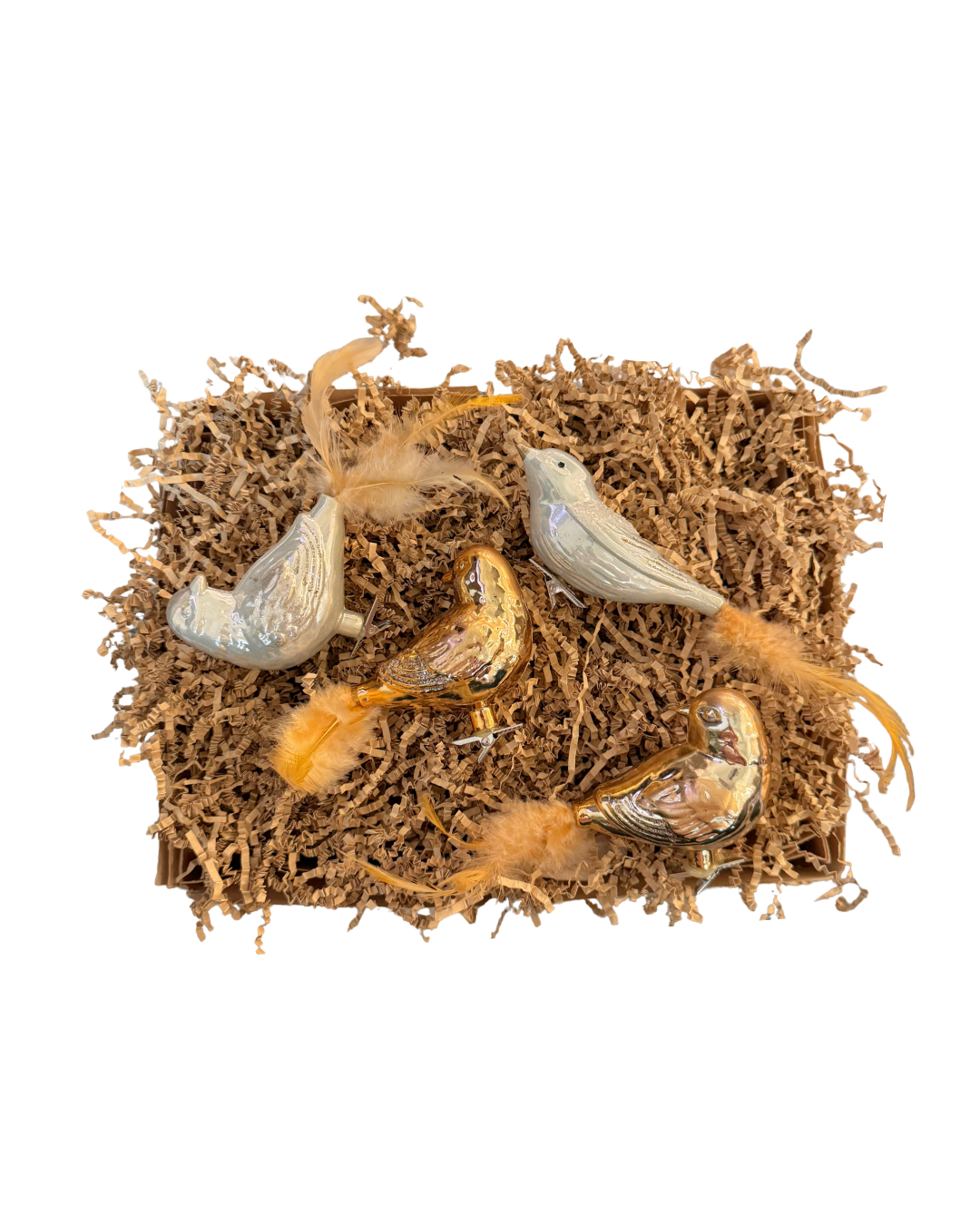 This delicate set of four vintage glass bird ornaments features two in shimmering gold and two in icy blue, each finished with original feather tails and metal clips for easy attachment to your tree. With their charming mid-century style and gentle signs of age, these birds bring a whimsical, nostalgic touch to any holiday display.