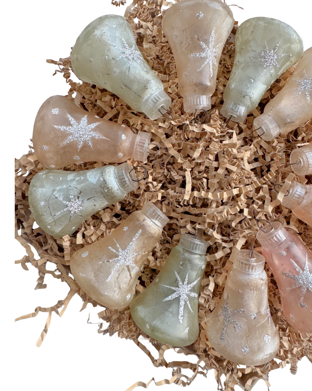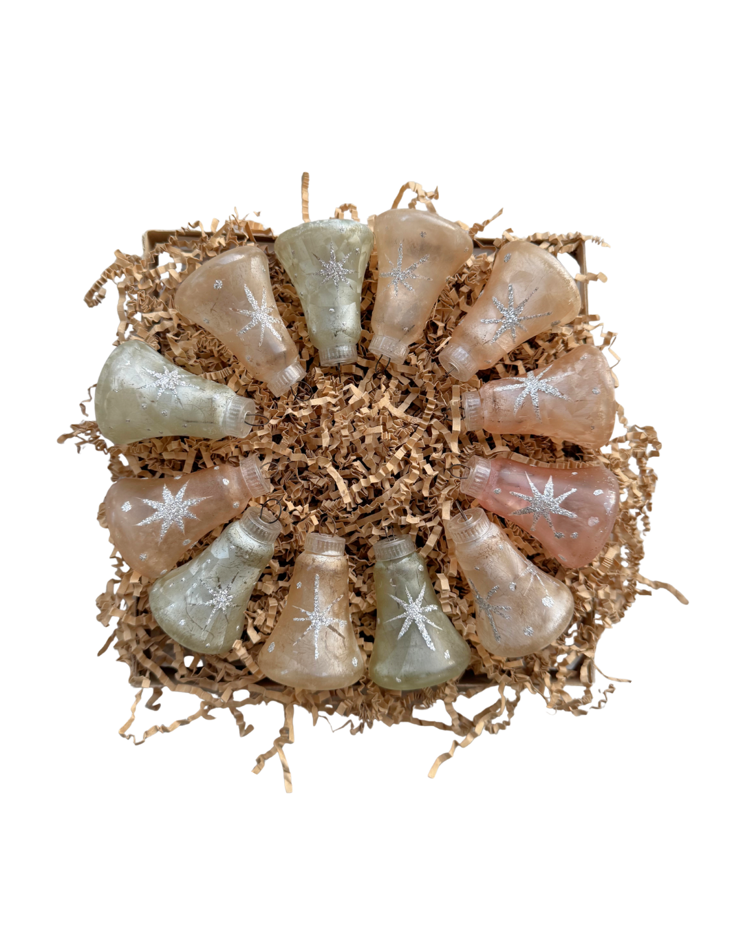 This charming set of vintage glass ornaments features 12 delicate bell-shaped pieces in soft pastel shades of pink, gold, and green. Each ornament is hand-painted with silver glitter starbursts, adding a touch of sparkle to their nostalgic style. Made from thin vintage glass, they carry the gentle wear and variations that make each one unique. Perfect for bringing mid-century holiday magic and timeless charm to your Christmas tree.